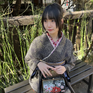 古着風着物には、ゆるっとまとめたローポニーや三つ編みアレンジが相性抜群。髪飾りはつまみ細工やアンティーク調のヘアピンを使うと、レトロな雰囲気がより引き立ちます。メイクはマット系の赤リップや、アイラインを少し跳ね上げたクラシカルメイクで仕上げてみてください。浅草の街並みにぴったり映えるスタイルです。