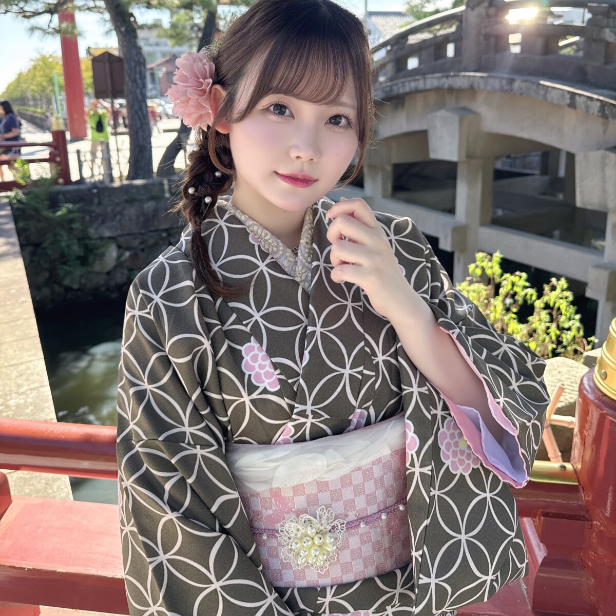 落ち着いた色味をベースにした着物は、派手すぎず、それでいてしっかりと存在感を引き出してくれるのが魅力。今回のコーデは、ブラウン系の七宝柄に淡いピンクの差し色を効かせたまさに大人レトロな一着。日本の伝統文様である七宝柄は「ご縁」や「円満」を意味し、古くから愛されてきたクラシカルなデザイン。その中に洋風テイストの帯や小物を組み合わせることで、一気にアンティーク風の雰囲気に仕上がります。特に、淡いピンクの帯やレース飾りは、やわらかさと可愛らしさをプラスしてくれるポイント。全体のトーンを統一することで、写真映えも抜群に。