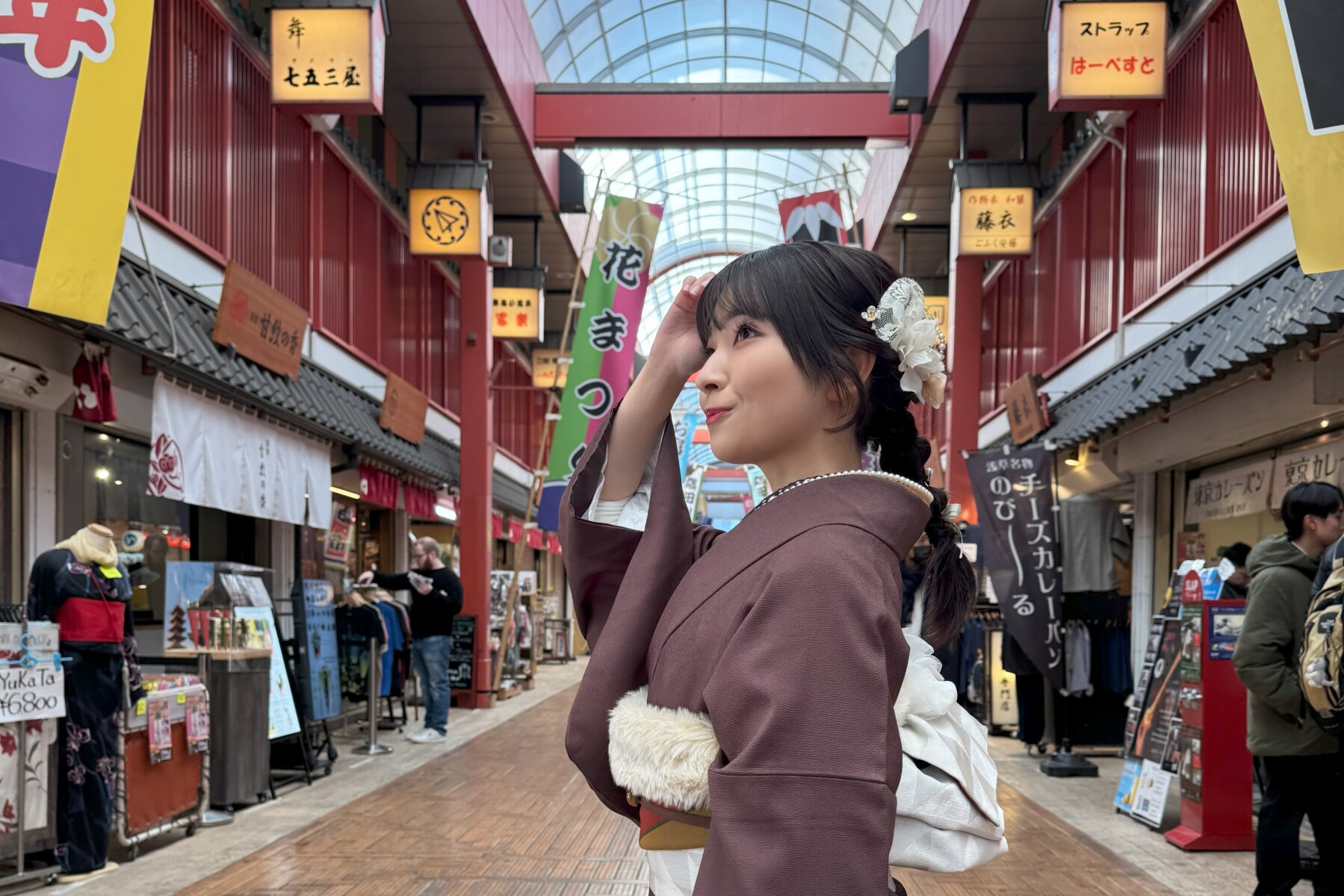 浅草駅周辺は、古き良き日本の街並みが残る雰囲気が魅力的です。この街を散策するには、ぜひ着物を着て楽しみたいものです。