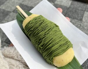 見た目のインパクト抜群!「モンブラン芋団子」もちもちのお団子に抹茶モンブランをたっぷり絞った進化系スイーツ!