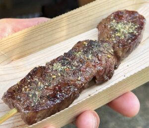男性にもおすすめ!「嵐山牛串」 ガッツリ食べたい男性や学生に人気のボリューム系グルメ。しっかりとお肉を感じることができます。