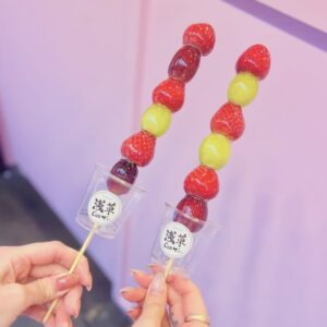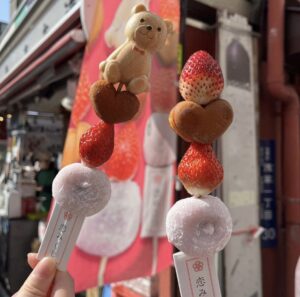 老舗の和菓子店「菊水堂」が出してる”恋みくじ付き”の「いちごカステラ串」。真っ赤なイチゴとハート型のカステラが串に交互に刺さってて、見た目が超キュート。甘酸っぱさ×ふんわりカステラの優しい甘さで、食べ歩きにもぴったり。仲見世の和風な街並みに映えて、着物姿で手に持てばインスタ映え確実。浅草で”映え×和スイーツ”を楽しむなら、要チェックな一品です。