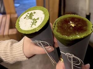 浅草茶屋たばねのしは、着物で浅草散策する人に大人気の人気和クレープ専門店。静岡・掛川茶抹茶を使った「抹茶ブリュレクレープ」は、表面をパリッと焼いた香ばしさと濃厚クリームが絶品で、写真映えも抜群。和紙のようなクレープ生地と和柄の包装が着物姿と相性よく、浅草で”和スイーツ×映え”を楽しむなら外せない一品。散策途中の片手スイーツにもぴったりです。
