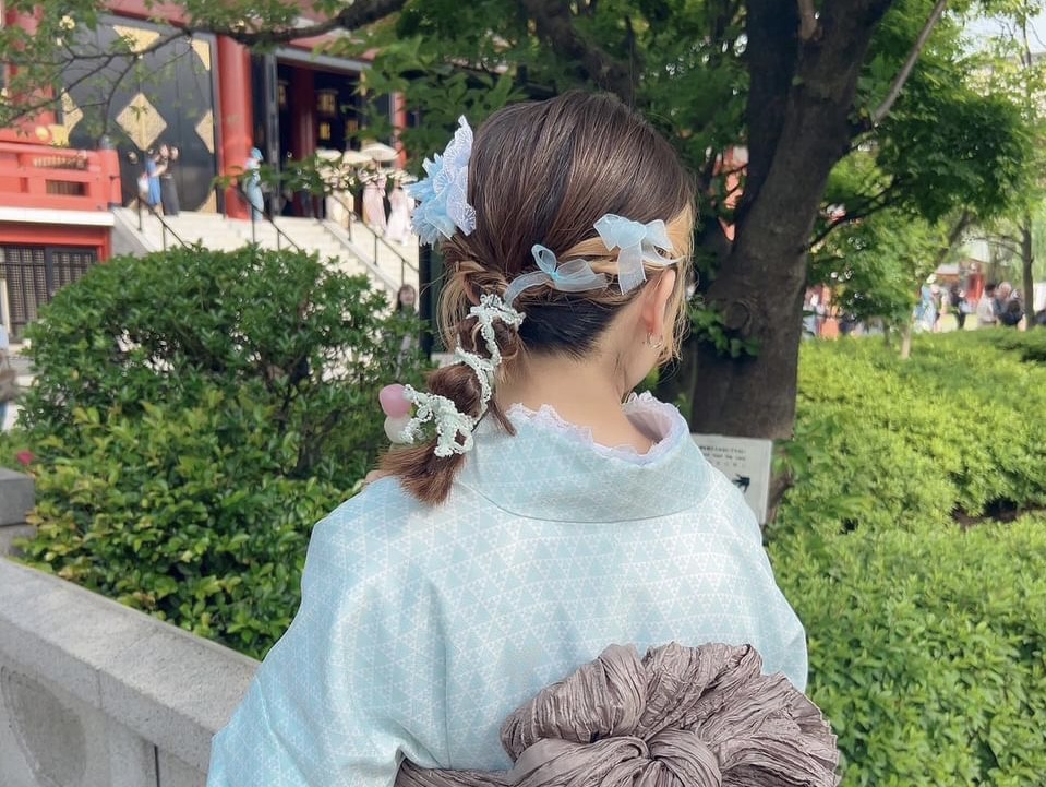 ヘアセット込みなので、当日そのまま来店しても安心。髪飾りが選び放題のため、レトロから大正ロマン風まで幅広く仕上げられます。