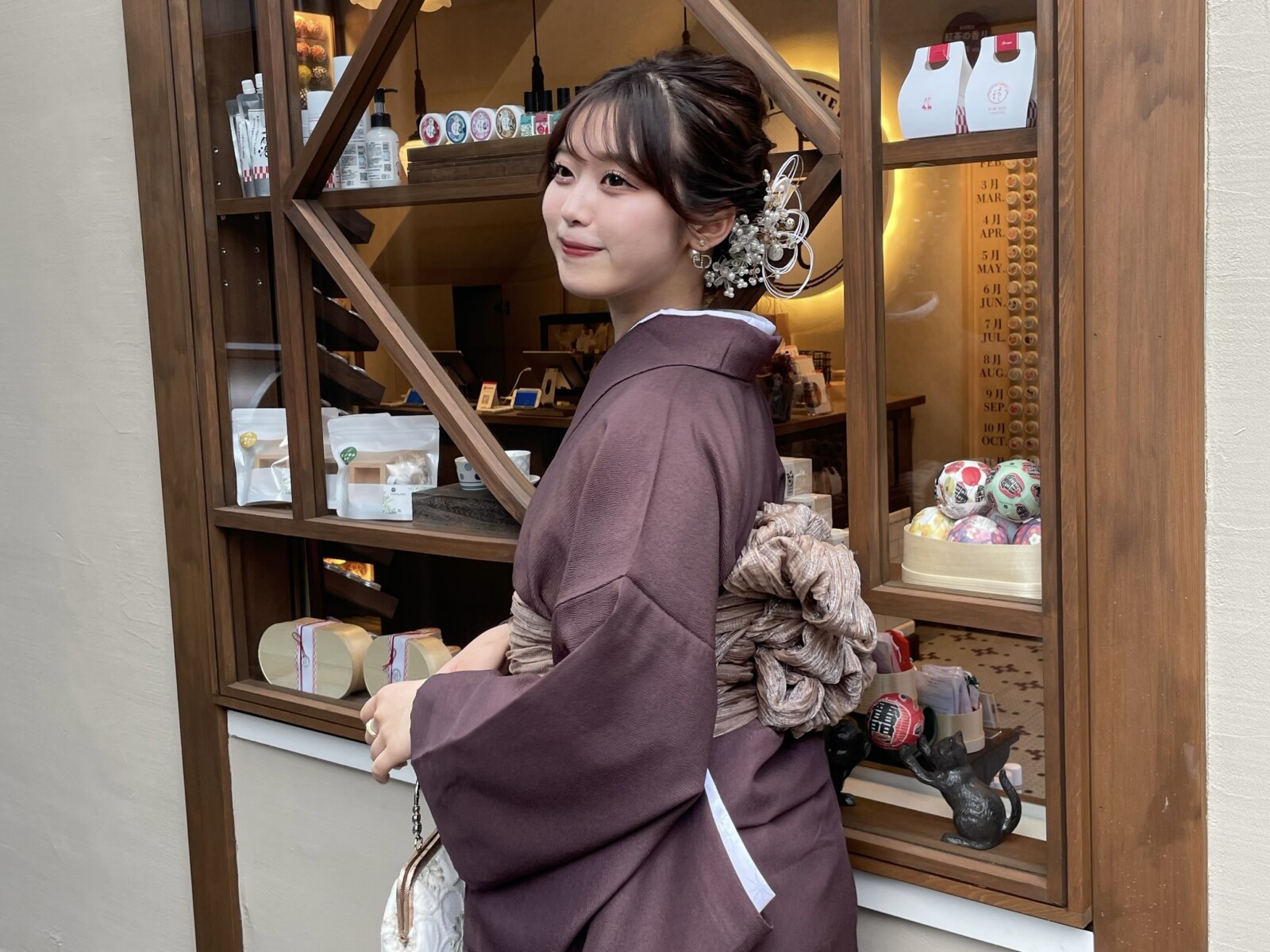浅草着物レンタル和楽では、アンティーク調やくすみカラー、黒ベースなど地雷系と相性の良い着物を多数用意。帯やレース小物、リボンアレンジで世界観を完成させます。ただ、かわいいではなく、ちゃんと地雷系。ここがポイント!