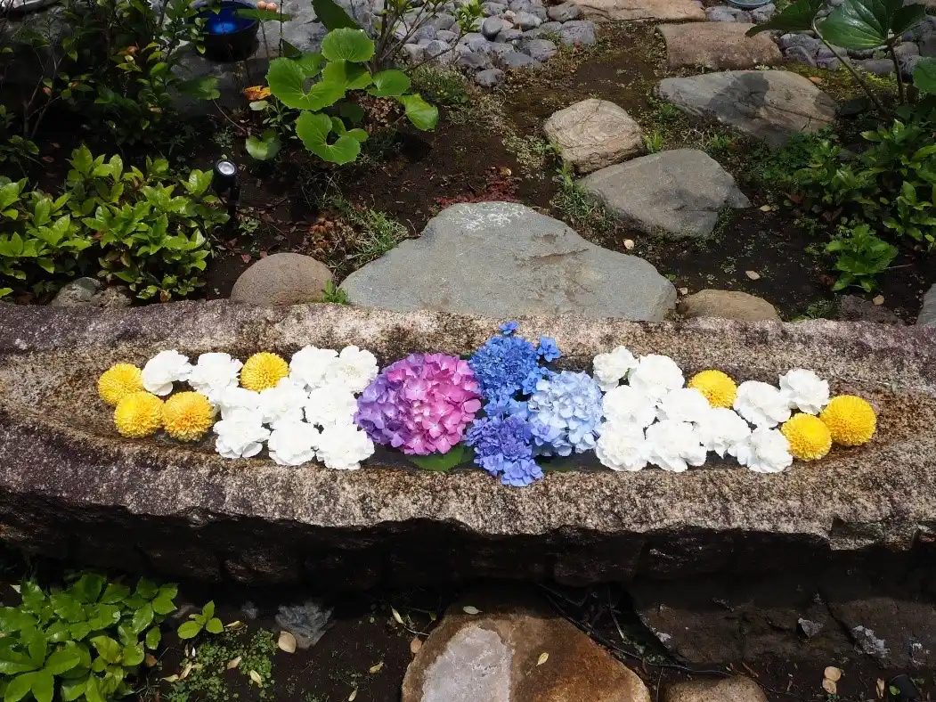 季節の花で敷き詰められた花手水はとても色鮮やかで、かつ華やかさがあります。