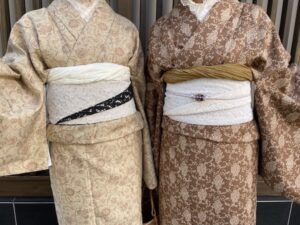 いづれにしても紬の着物は、歩くたびにシュッ、シュッと鳴るあの「絹鳴り」が、とても気持ちよくクセになります。織の紬着物には染の名古屋帯がよく会います。