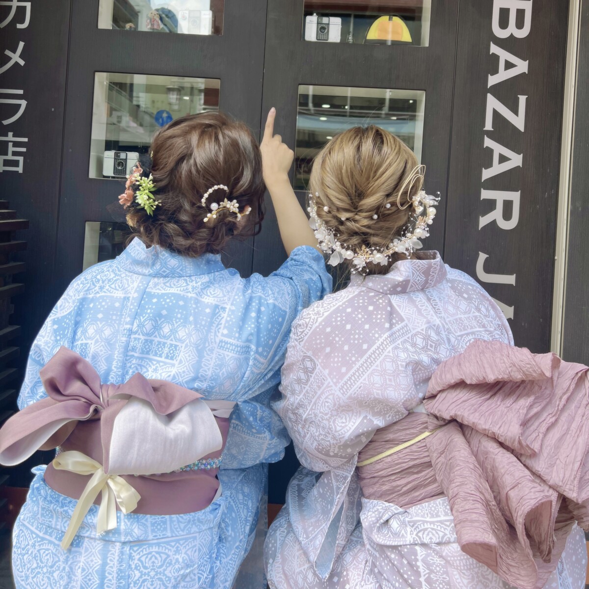 It takes about 15 minutes for us to dress you in the yukata and another 15 minutes for hair styling. The entire process including reception, selecting a yukata and accessories, and storing belongings, typically takes around an hour to an hour and a half. On quiet days, you can be out in 45 minutes, but during busy seasons, please allow for around an hour and a half. The time you’ll need depends on how long it takes to select the yukata and accessories, as well as how busy the store is on that day, so please take these times as a reference only.