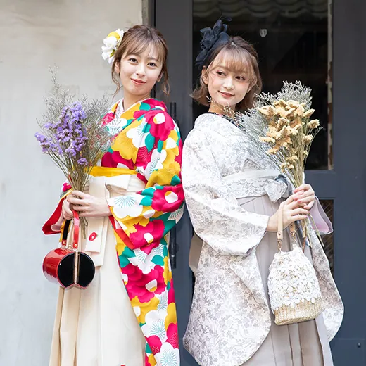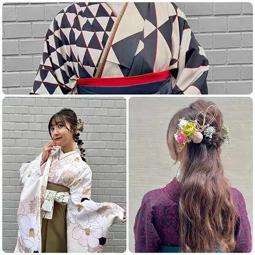 At our shop, we offer a wide range of Nishaku-Sode and Furisode styles, from glamorous, elegant looks to classic retro-modern Hakama outfits. You can select a style that matches your personal taste and mood!