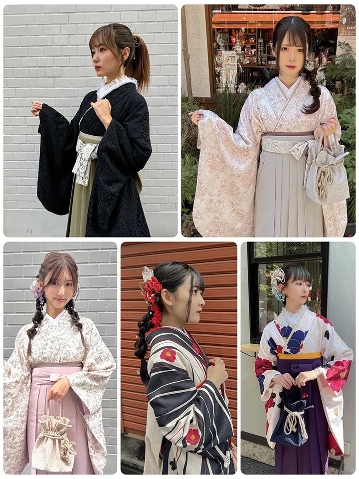 Our collection includes a wide range of styles — from classic modern-retro patterns to adorable girly designs. Whether you want a glamorous Taisho Romantic-style coordination or a stunning and luxurious Hakama look, we have plenty of options for you to find your perfect match!
