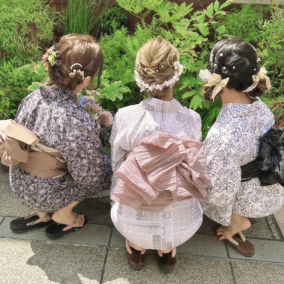 用意されている様々なデザインと色の着物のどれを選んでも、お値段が同じです。人気の着物や小物の在庫を十分に揃えているので、当日予約しても様々な種類の中から自由にお選びいただけます。また、すべての年齢のお客様にふさわしい着物が用意されているので、家族同士でご利用にもお勧めです。