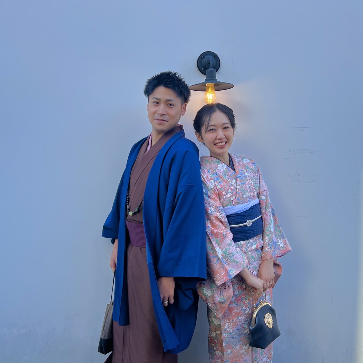 男性は定番シンプル系で、女性はアンティーク着物にレトロバッグを合わせてコーデ