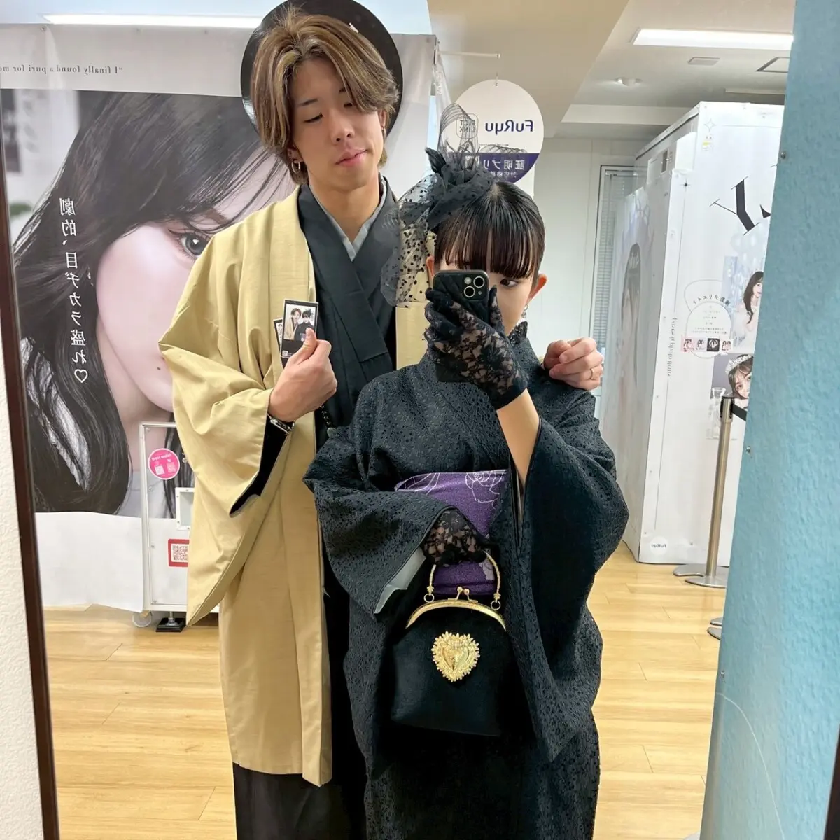 黒レース×ベージュの上品モダンな和装カップルコーデ。大人っぽく統一感があり、写真映えも抜群