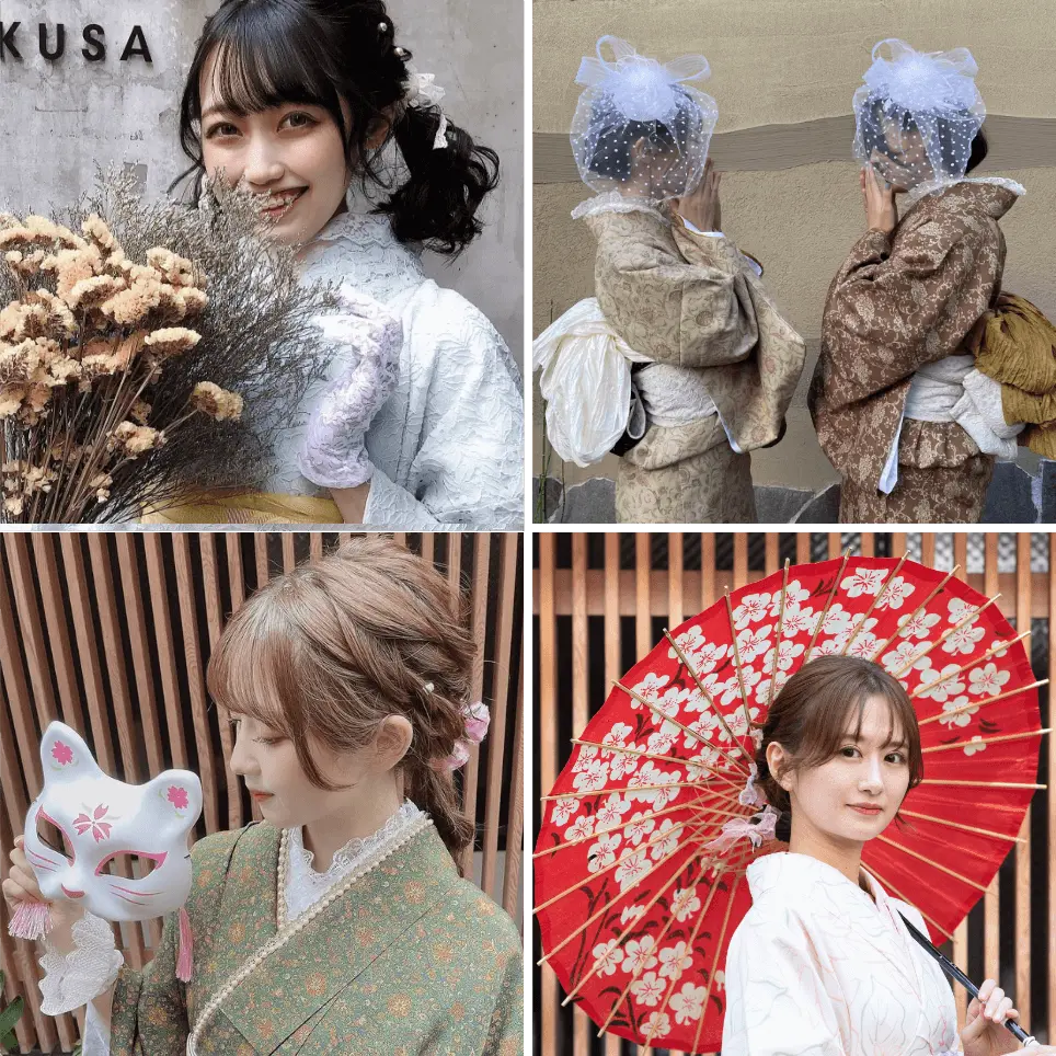 当店では全てのプランに着物レンタル一式と小物レンタル一式が含まれているため、特にお持ち頂くものはございませんが、秋冬の寒い季節などはヒートテックなどの暖かい肌着を来ていただいてもよろしいかと思います。また、カイロもおすすめです。