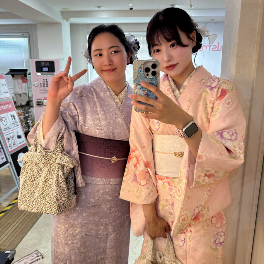 修学旅行プランでお得に着物レンタルができると思っていたのに、着たい着物のデザインは別料金だった…という体験談もよく聞きます。和楽の修学旅行プランでは、店内に置いてある全ての着物から追加料金なしでお選びいただけます。レース着物やアンティーク着物、モダンな和柄の着物や個性的なレトロ柄の着物、パステル系の淡い色の着物など、500種類以上の着物を豊富にご用意。帯の組み合わせも自由なので、お友達と一緒に今人気のシミラーコーデにするもよし、他の人と被らないように個性的なコーデを組むのもよし!お好きなデザインの着物と帯の組み合わせで、トータルコーディネートすることが可能です。どんなコーデにするか選びきれない、という方はホームページやInstagramにも着物コーデを掲載しているので、事前にチェックしてみてください。