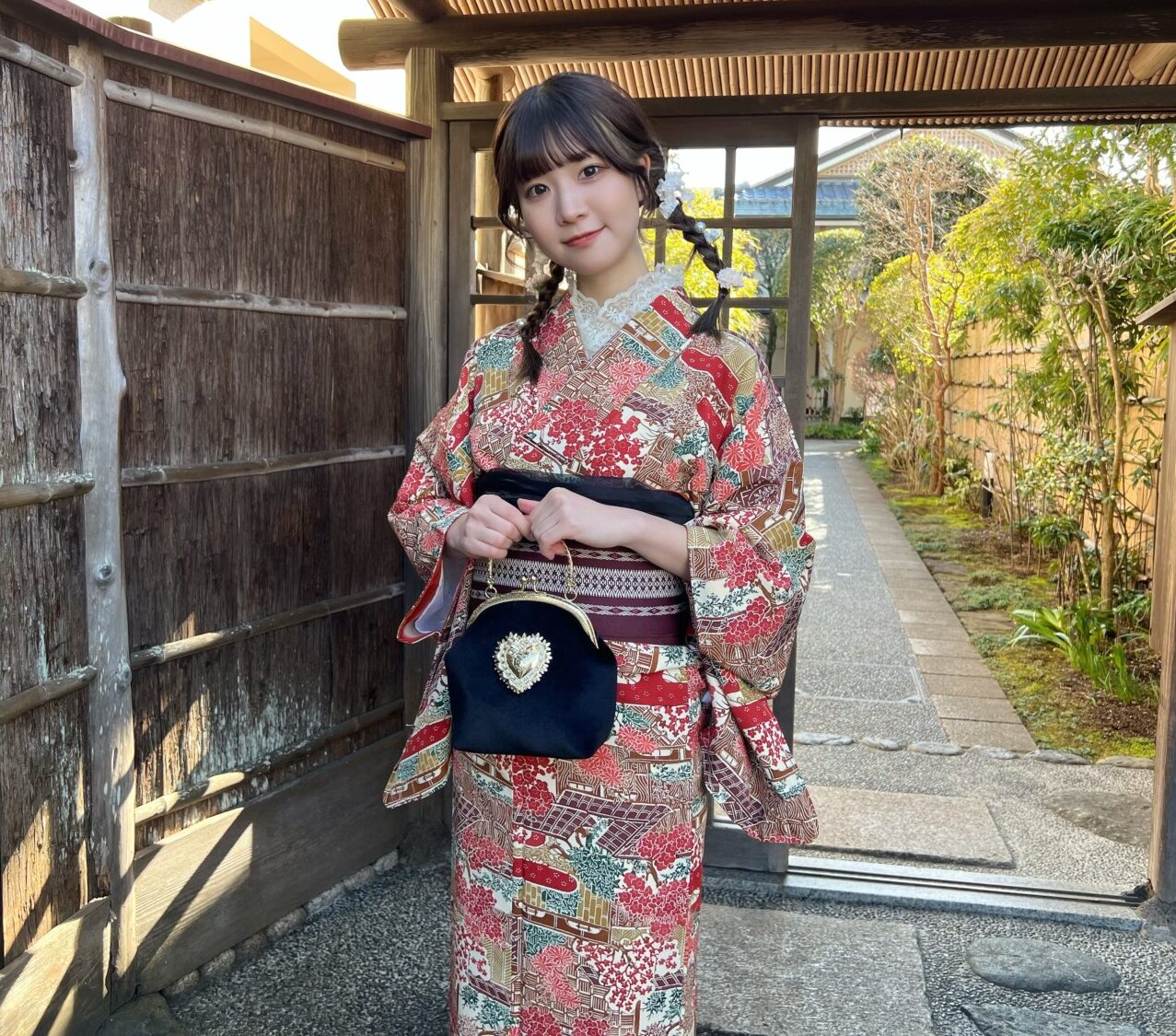 レトロ系着物コーデは最近のトレンドであり鎌倉の街並みにも映えるデザインです。