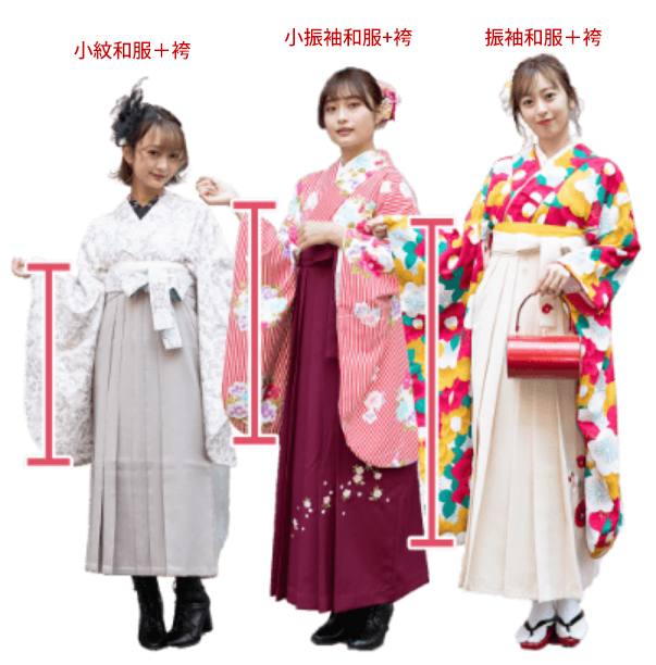我們準備了超豐富的袴款式,從優雅的蕾絲點綴到精緻的刺繡款,顏色也從明亮柔和的色系到經典的深藍、墨綠應有盡有,通通都能自由選擇!和服則可以依袖長選擇3種款式:小紋、小振袖、振袖,滿足不同場合的穿搭需求。想輕鬆穿著袴散步推薦選擇「小紋+袴」,想體驗正統袴造型選擇「小振袖+袴」,想打造華麗注目造型選擇「振袖+袴」。